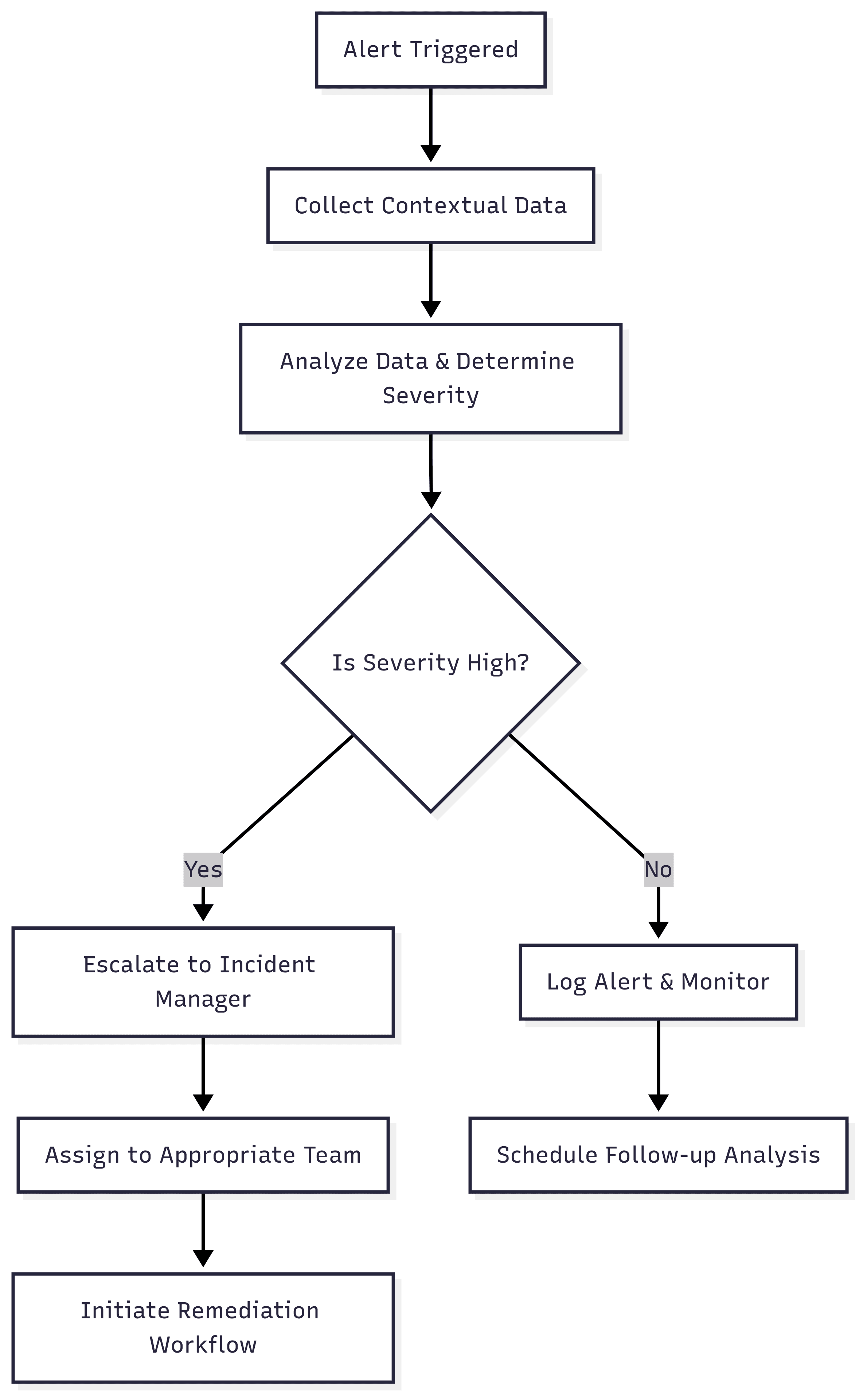 The orchestration engine gathers supplemental data from various sources such as system logs, performance metrics, and configuration management databases. This enriched context helps understand the underlying conditions of the alert.Assessment & Prioritization